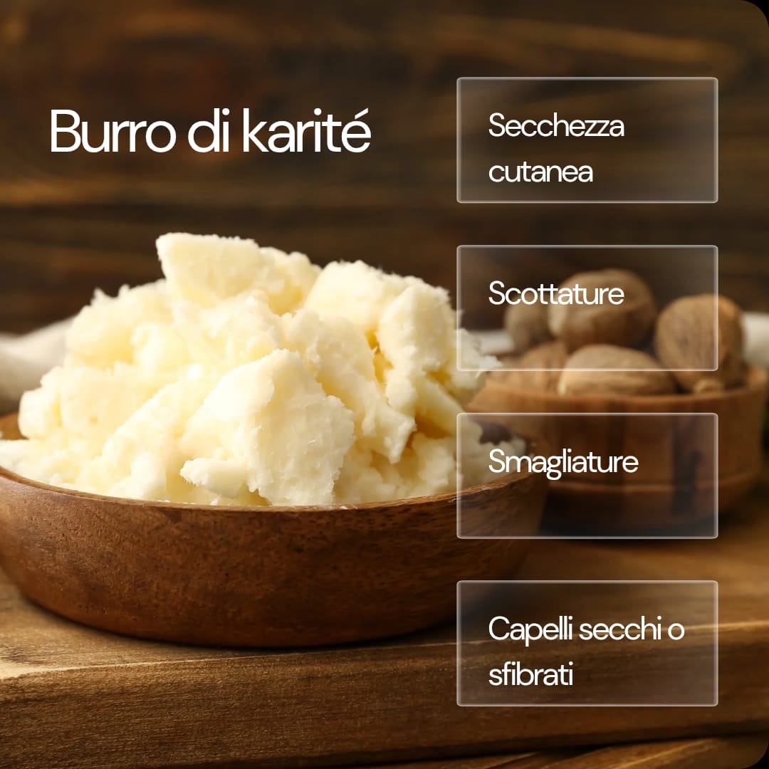 Originario delle savane africane, il Burro di Karité viene estratto dai semi della Vitellaria Paradoxa, nota anche come “albero della giovinezza”. Il suo alto contenuto di acidi grassi, vitamina A ed E lo rende un vero toccasana per le pelli stressate, secche o sensibili.